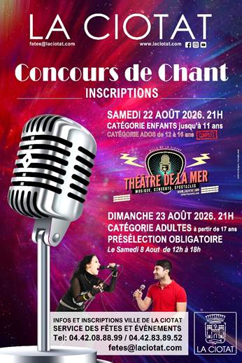 Comme l'an dernier, Le"service des fêtes et évènements" de La Ciotat a contacté Nicolas pour proposer aux élèves de notre classe de chant de participer au concours de chant qu'il organise le samedi 22 et le dimanche 23 Août prochains au Théâtre de la mer, esplanade de la capitainerie du vieux port de La Ciotat à 21h.